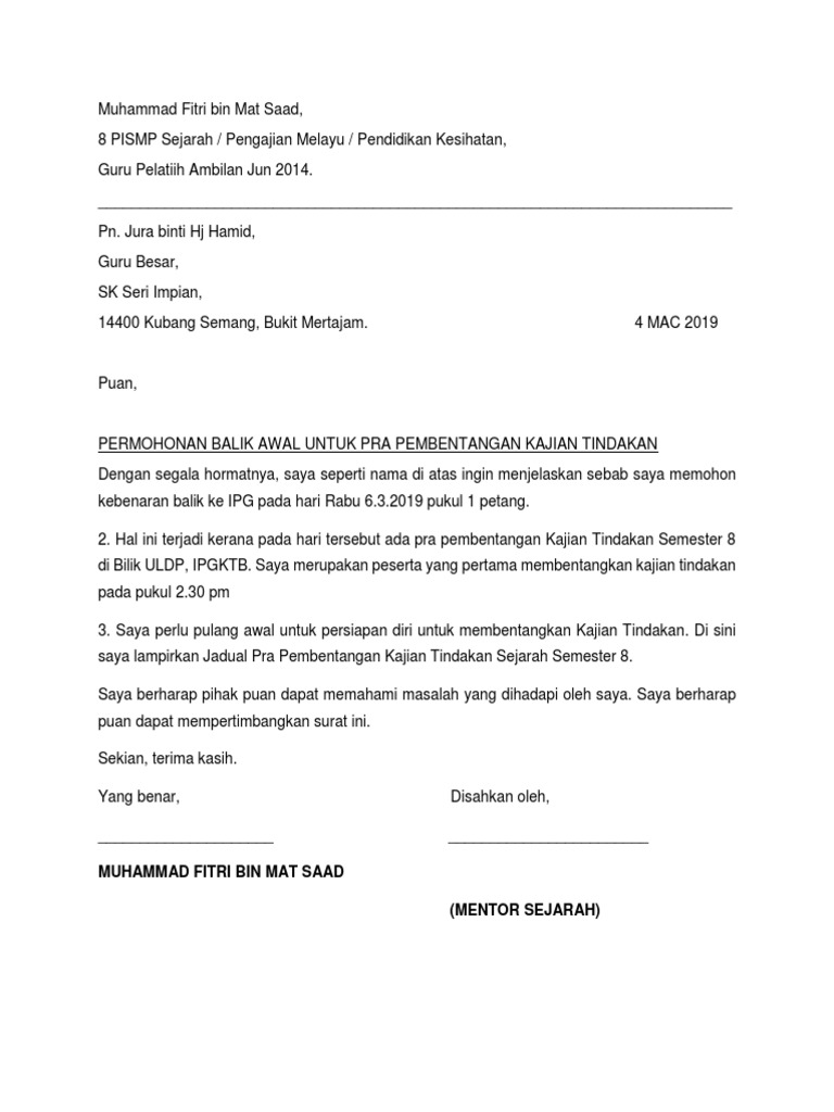 Contoh Surat Mohon Kebenaran Balik Awal Dari Sekolah Flip My